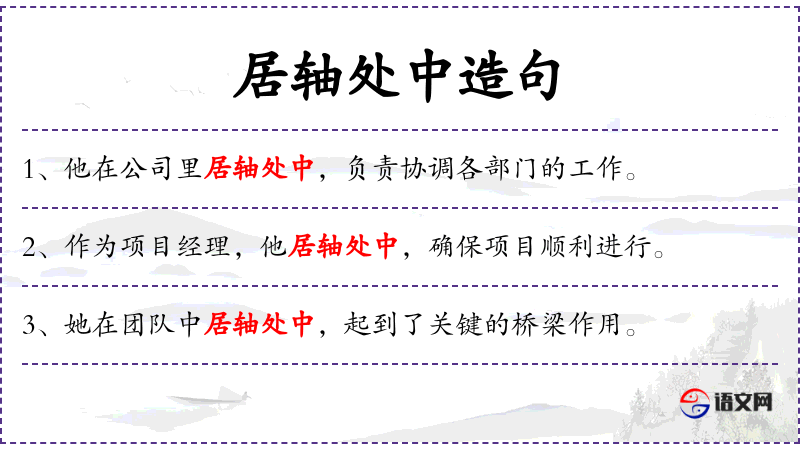 - 居轴处中:成语,意为处于核心位置。 *. 负责:动词,表示承担责任。