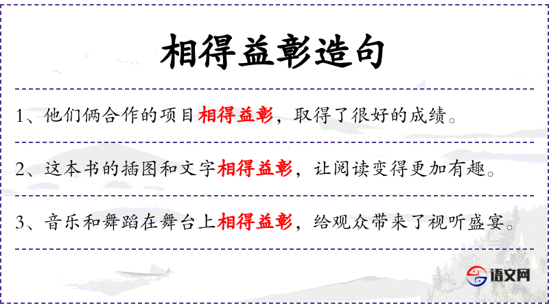 7. 【相得益彰】 相行:互相配合、映衬;益:更加;彰:显著。指两个人或两件事物互相配合,双方的能力和作用更能显示出来。