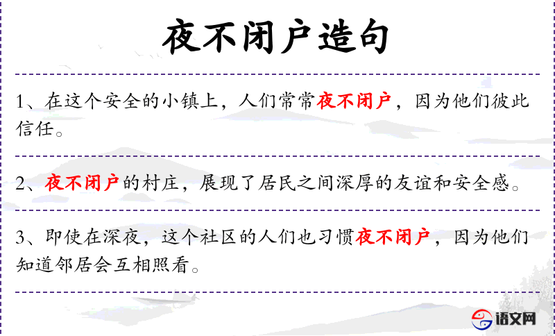 - 夜不闭户:指晚上不锁门,形容社会治安良好,人们互相信任。