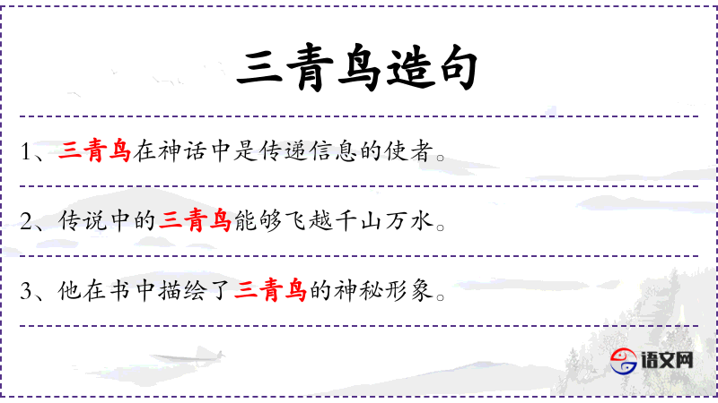 1. 【三青鸟】 - 传说中的仙鸟名; 借指使者。