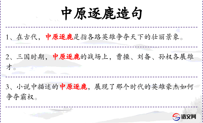 句子:“在古代,中原逐鹿是指各路英雄争夺天下的壮丽景象。”