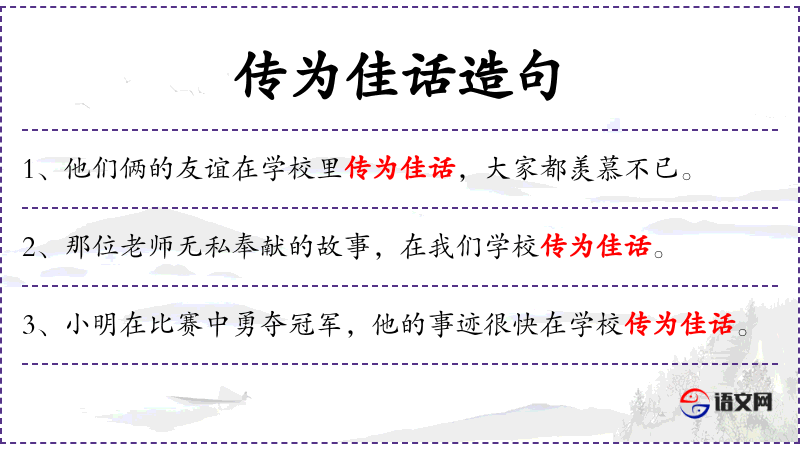- 传为佳话:固定短语,意思是广为流传并被赞扬的故事。