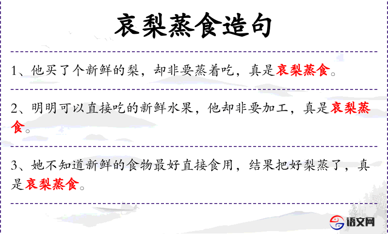 - 哀梨蒸食:成语,比喻不懂得珍惜好东西,反而糟蹋了它。