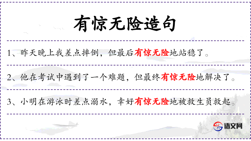 1. 【有惊无险】 - 虽受到惊吓但还是安全脱离险境。