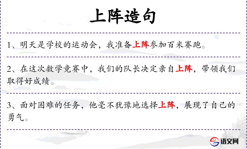 1. 【上阵】 上战场打仗; 用以比喻亲身参加某种活动。