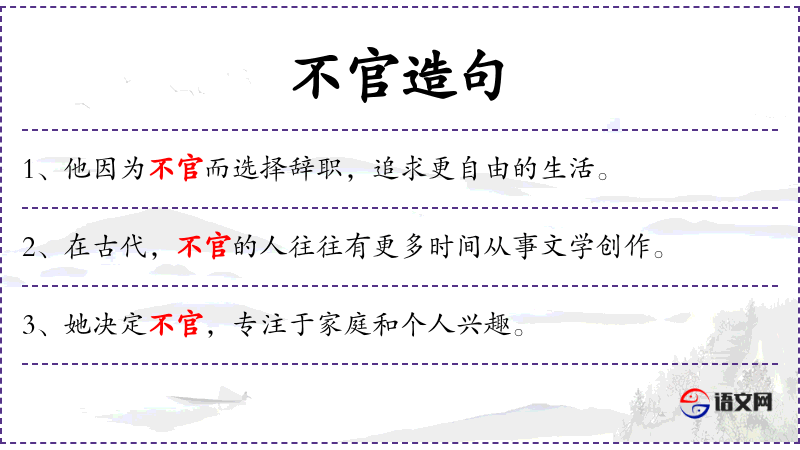 1. 【不官】 - 不担任官职; 不任以官职; 非官方的。指通过不正当的途径; 不到官府,犹言不自首。