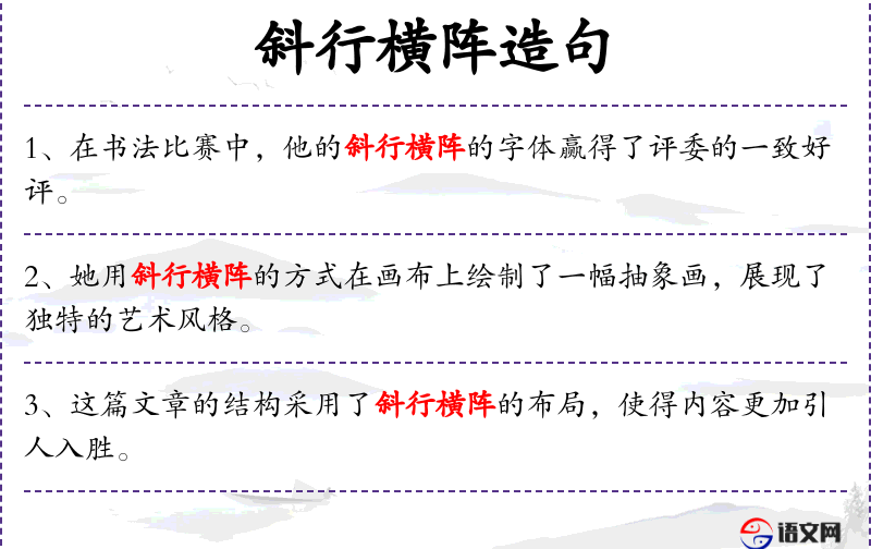 句子:“这幅古代壁画的图案采用了斜行横阵的设计,显得古朴而神秘。”
