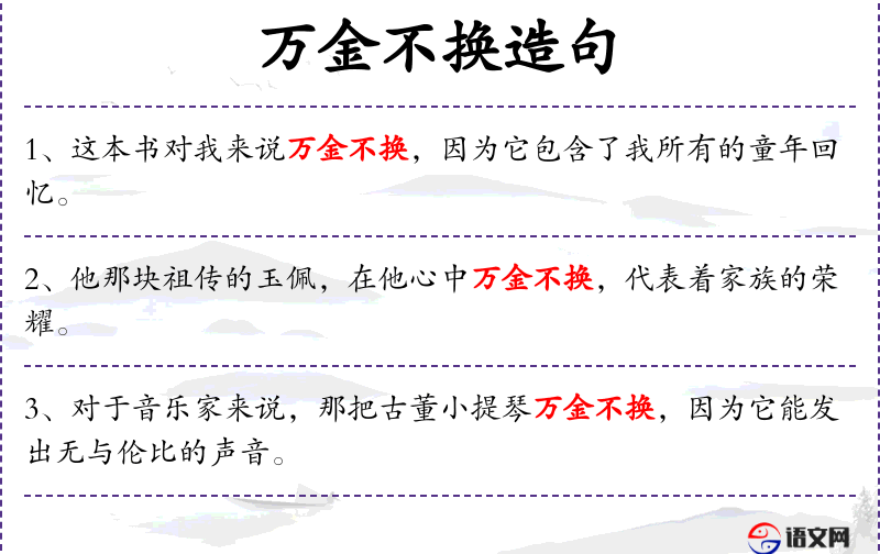 - 万金不换:表示某物极其珍贵,无法用金钱衡量。