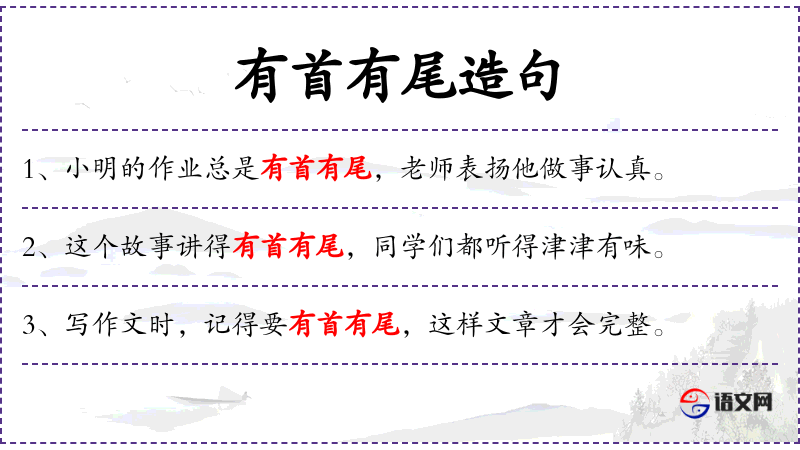 1. 【有首有尾】 - 首:头。有开头,有结尾。做事能坚持到底。指故事或文章结构完整