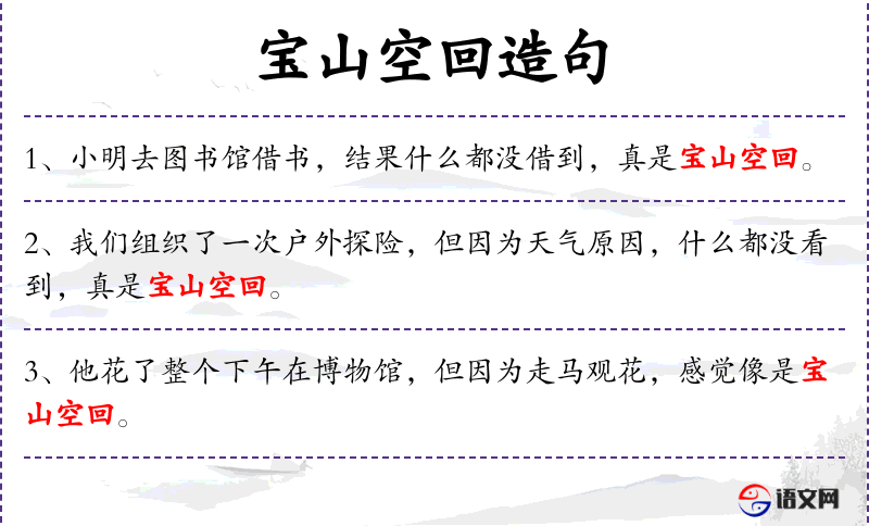 - 宝山空回:成语,比喻本可以大有收获却白白地无功而返。