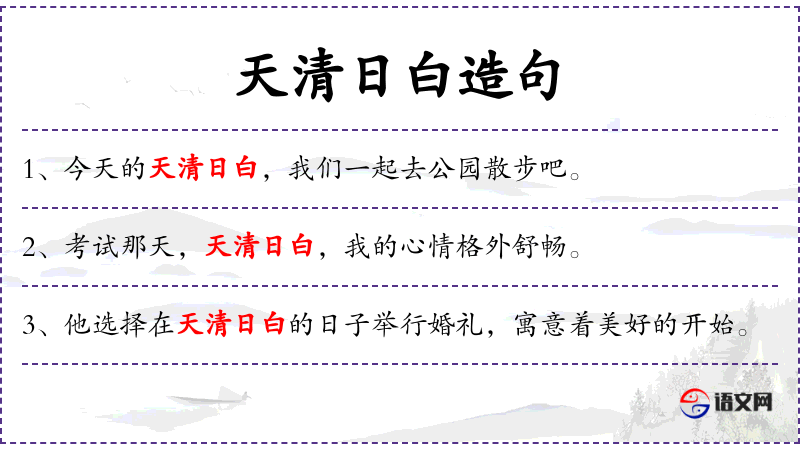 - 天清日白:形容词短语,形容天气晴朗、明亮。