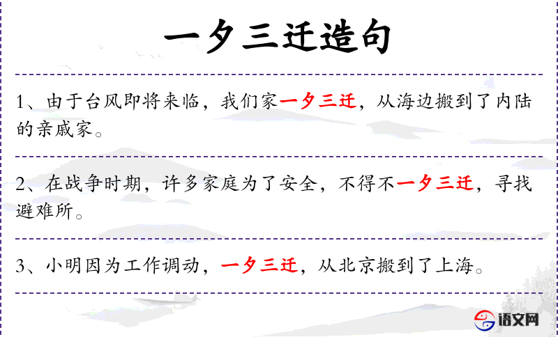 - 一夕三迁:形容短时间内多次搬迁。
