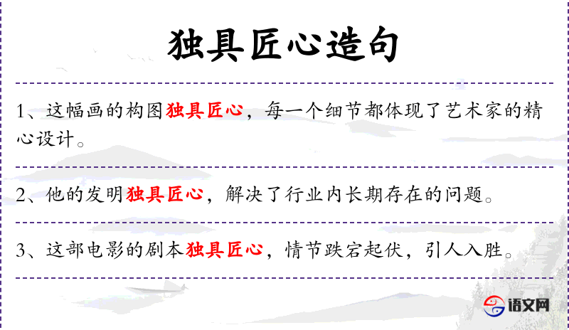 3. 【独具匠心】 - 匠心:巧妙的心思。具有独到的灵巧的心思。指在技巧和艺术方面的创造性。