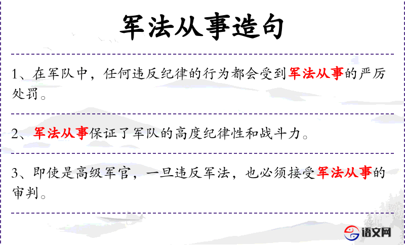 - 宾语:“军法从事的审判”