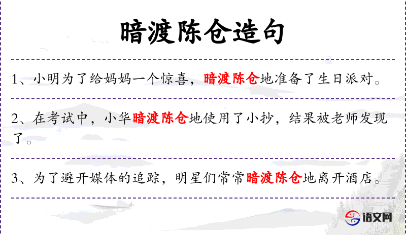 3. 【暗渡陈仓】 - 渡:越过;陈仓:古县名,在今陕西省宝鸡市东。比喻用造假象的手段来达到某种目的或暗中进行活动
