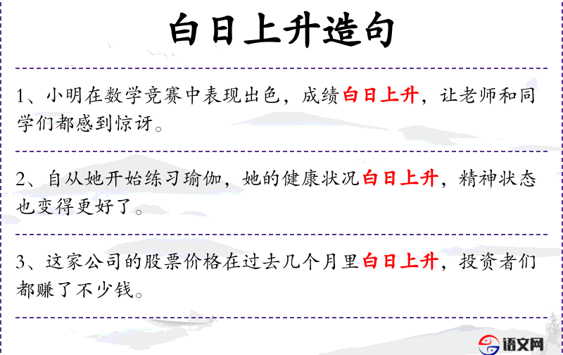 3. 【白日上升】 - 犹言白日升天。道教谓人修炼得道后,白昼飞升天界成仙。