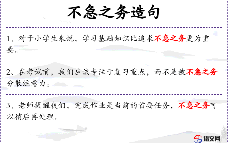 1. 【不急之务】 - 急:急迫,要紧;务:事情。无关紧要的或不急于做的事情。
