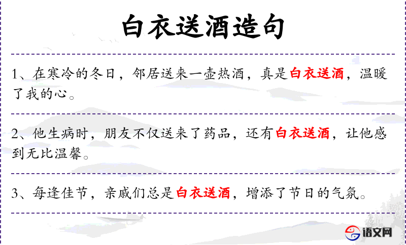 2. 【白衣送酒】 - 身穿白衣的人前来送酒。后泛指送酒的人。也比喻自己所渴望的东西朋友正好送来,遂心所愿。