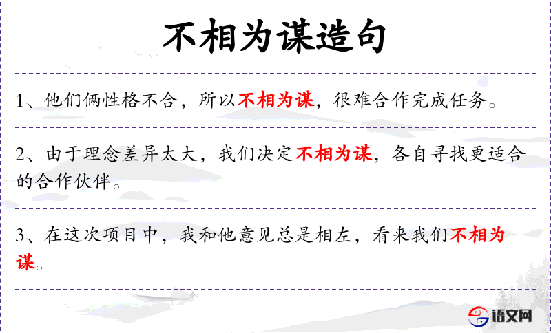 - 不相为谋:指不合作或不共同策划某事。