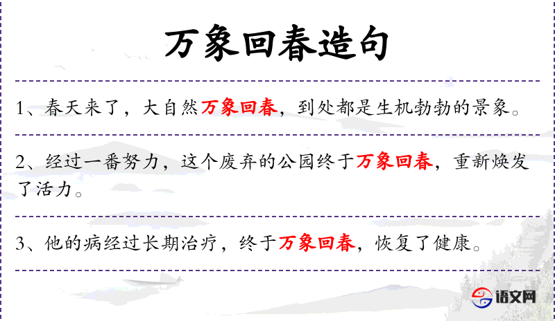 - 万象回春:这个成语源自**传统文化,常用来形容春天万物复苏的景象,也用来比喻社会或个人经历困难后重新焕发生机。