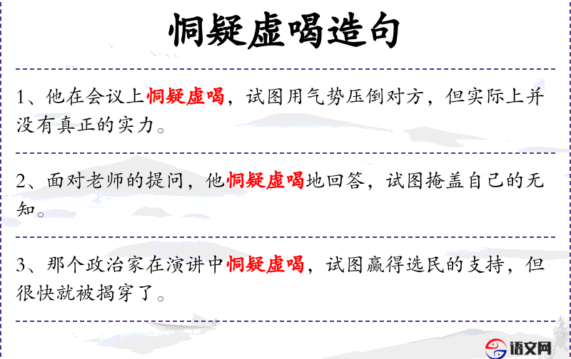 - 恫疑虚喝:这个词组的意思是通过恐吓和虚假的言辞来威胁对方。