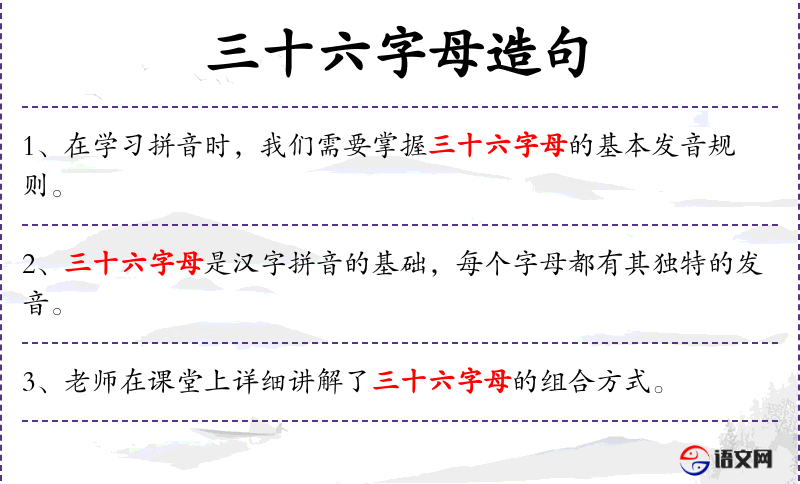 1. 【三十六字母】 宋代汉语语音三十六个声母的代表字,初由唐末守温定为三十个字母,宋代等韵学家又增非﹑敷﹑奉﹑微﹑床﹑娘六母,合称"三十六字母"。
