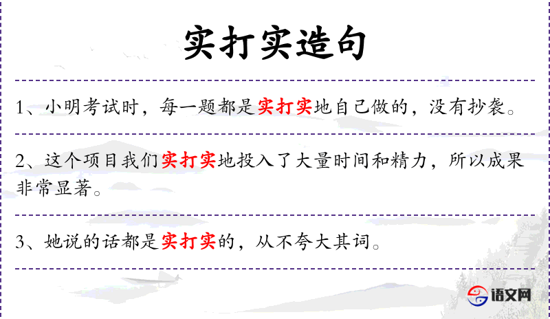 - 实打实的:形容词,表示真实、可靠,没有水分。