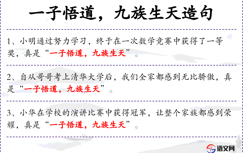 - 补语:让整个家族都感到荣耀 *. 插入语:真是“一子悟道,九族生天”
