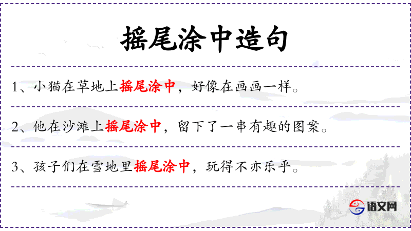 句子中的“摇尾涂”可能是一种比喻或象征,具体含义需结合文化背景。在某些文化中,沙滩艺术是一种流行的活动,人们通过在沙滩上绘制图案来表达创意和乐趣。