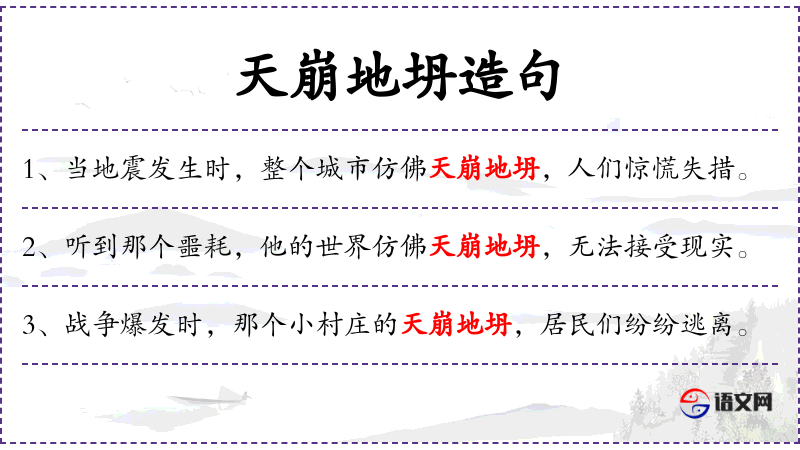 - “天崩地坍”这样的成语在**文化中常用来形容极大的灾难或变动。