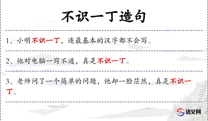 - 不识一丁:这个成语来源于《左传·僖公二十四年》,原意是指不认识一个字,比喻知识极其浅*。