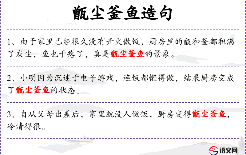 3. 【甑尘釜鱼】 - 甑里积了灰尘,锅里生了蠹鱼。形容穷困断炊已久。也比喻官吏清廉自守。