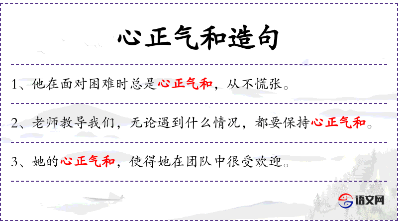 - 心正气和:形容词短语,形容一个人心态平和、正直。