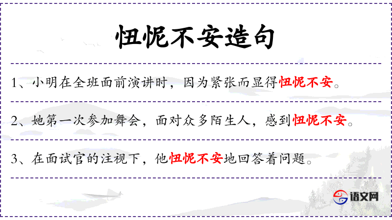 - 忸怩不安:形容词短语,形容人因为害羞或不安而表现出的不自然状态。