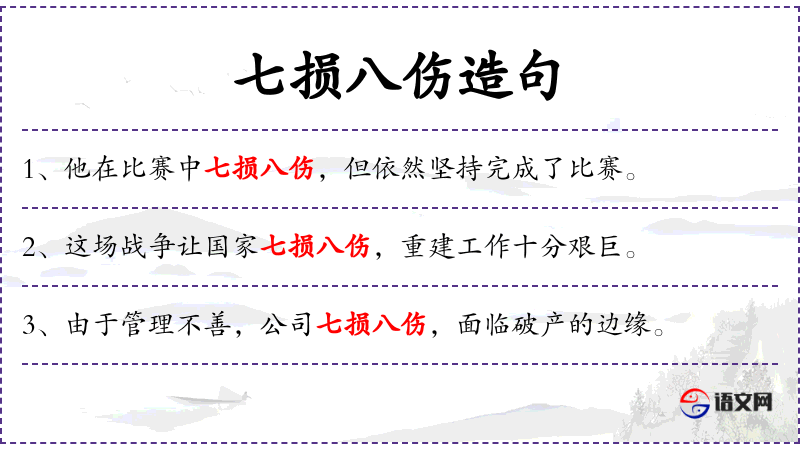 - 七损八伤:这个成语反映了**文化中对数字“七”和“八”的特殊含义,通常与不吉利或不幸联系在一起。