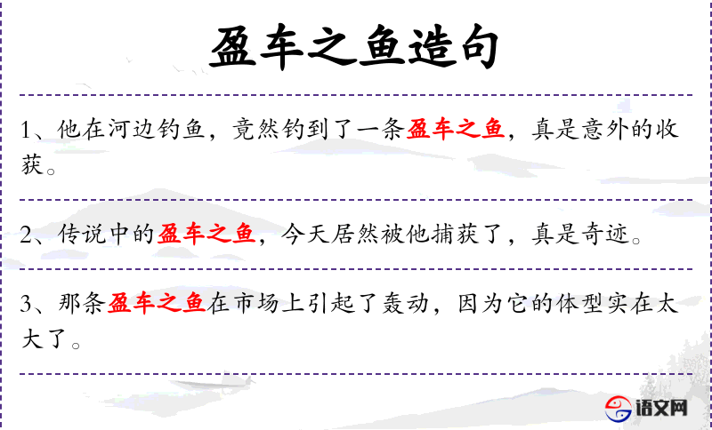 2. 【盈车之鱼】 - 盈:满。一条鱼能装满一辆车。形容鱼儿特别大而肥。