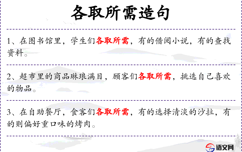 - 谓语:谓语是“各取所需”,表示学生们根据自己的需求进行活动。