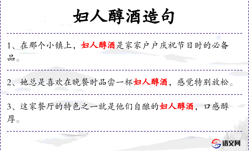 句子可能在描述一个家庭聚会或节日庆祝的场景,妇人醇酒的香气象征着喜庆和团聚。在不同的文化背景下,酒的香气可能唤起不同的情感和记忆,但普遍传达出一种温馨和舒适的氛围。