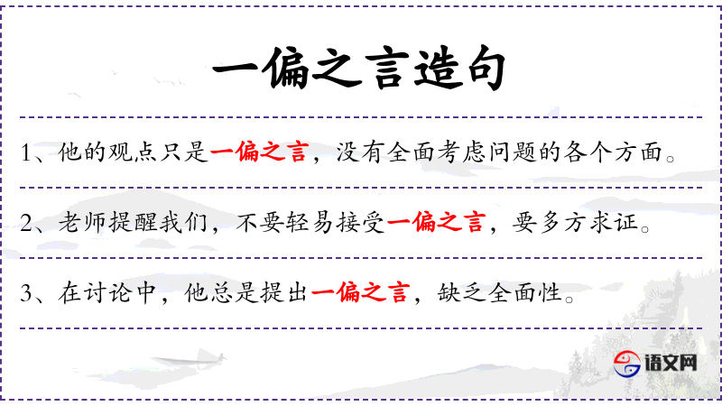 1. 【一偏之言】 争执的双方中一方所说的话。指单方面的话,片面的看法。