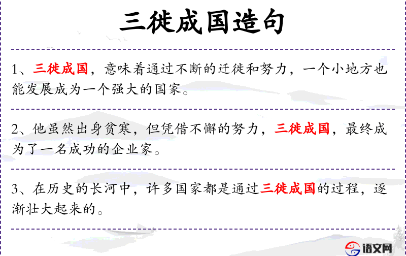 2. 【三徙成国】 形容圣人到处都受到百姓的拥戴。同“三徙成都”。