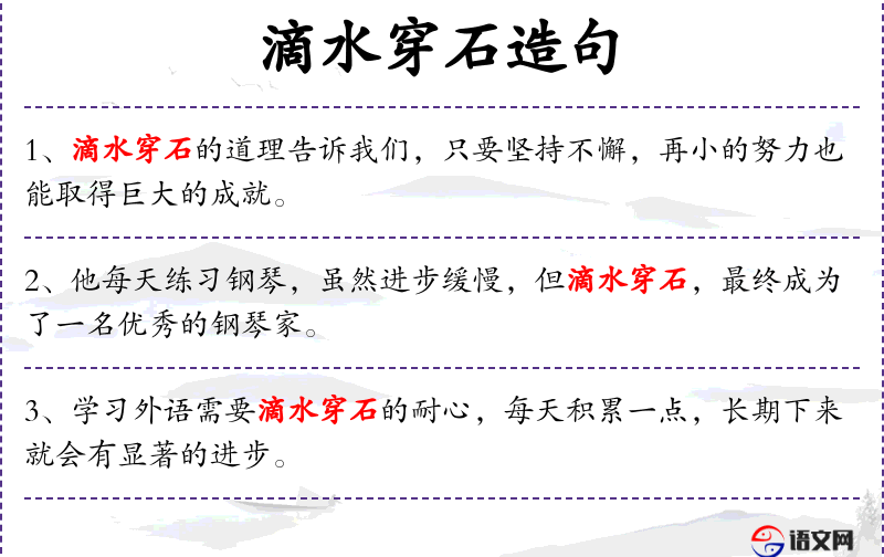 4. 【滴水穿石】 水不断下滴,可以闹穿石头。比喻只要有恒心,不断努力,事情一定成功。