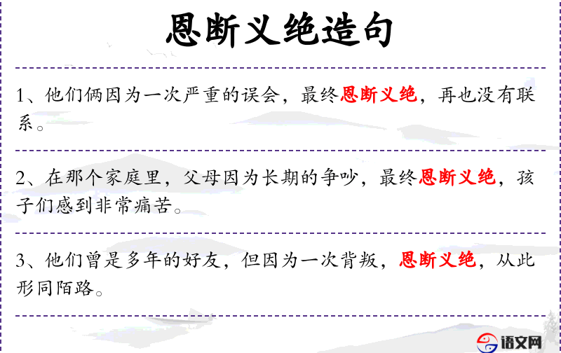 - 相关成语:“恩断义绝”与“断交”、“绝交”等成语相关,都表示关系的彻底破裂。