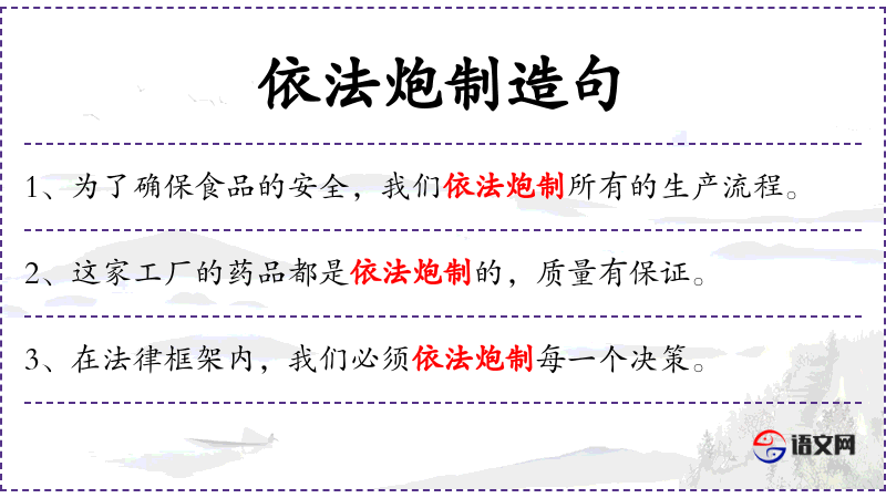 1. 【依法炮制】 依照老办法制中药。后比喻按照已有的模式去做。