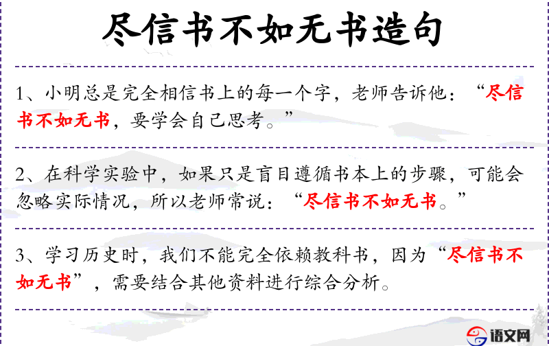 句子:“学*历史时,我们不能完全依赖教科书,因为“尽信书不如无书”,需要结合其他资料进行综合分析。”