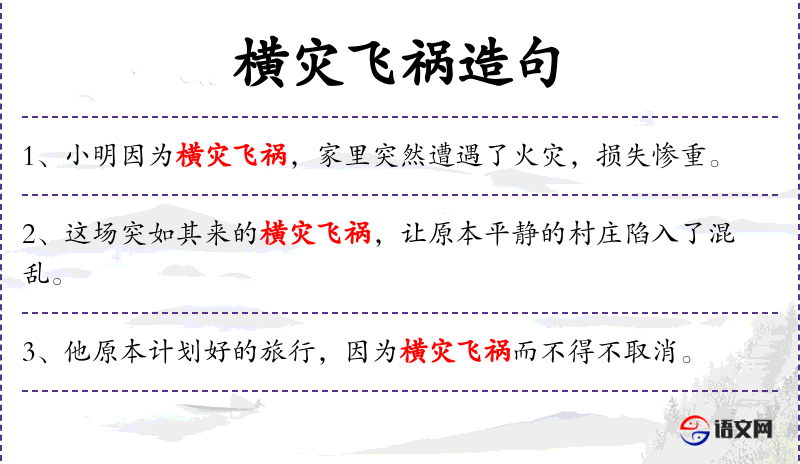1. 【横灾飞祸】 - 指意外的、平白无故的灾祸。同“横祸飞灾”。