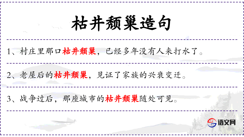1. 【枯井颓巢】 枯:没有水;颓:坍塌。干枯的水井,坍塌的鸟窝。形容荒凉遭受破坏的样子。