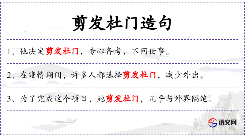 在翻译中,“剪发杜门”被解释为“cut his hair and stay indoors”(英文),“髪を切って家に閉じこもる”(日文),“seine Haare zu schneiden und zu Hause zu bleiben”(德文),这些翻译都准确传达了原句的隐居和专注备考的含义。