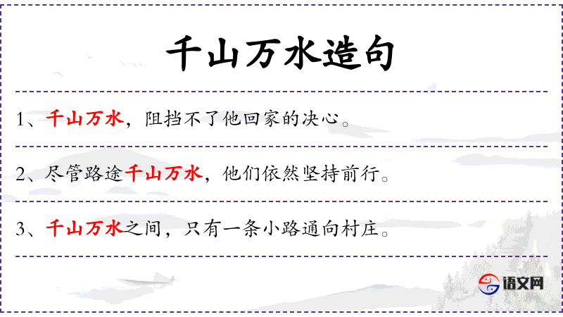 “千山万水”是一个典型的汉语成语,用来形容距离遥远或困难重重。这个成语在**文化中常被用来比喻坚贞不渝的情感,如友谊、爱情等。