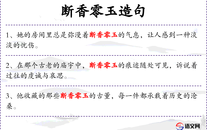 句子:“她的房间里总是弥漫着断香零玉的气息,让人感到一种淡淡的忧伤。”