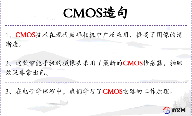 1. 【CMOS】 互补性氧化金属半导体。一种可记录光线变化的半导体,多用于数字相机、数字摄像机等电子产品。